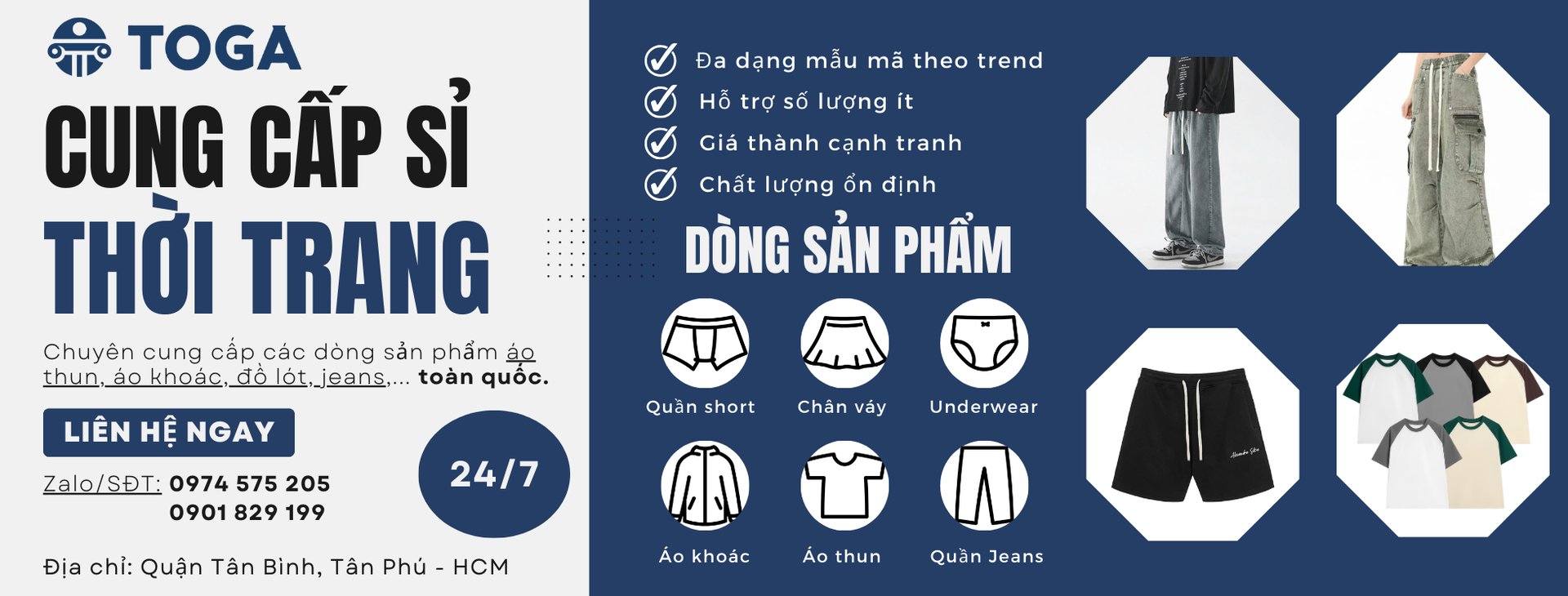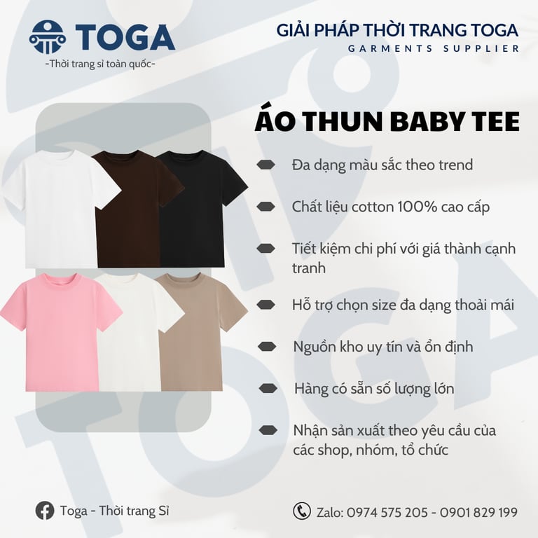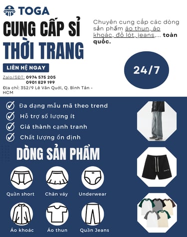Toga cung cấp/sản xuất các sản phẩm thời trang với đầy đủ mẫu mã theo trend, hỗ trợ số lượng ít cho các shop thời trang và các shop house trên sàn thương mại điện tử.